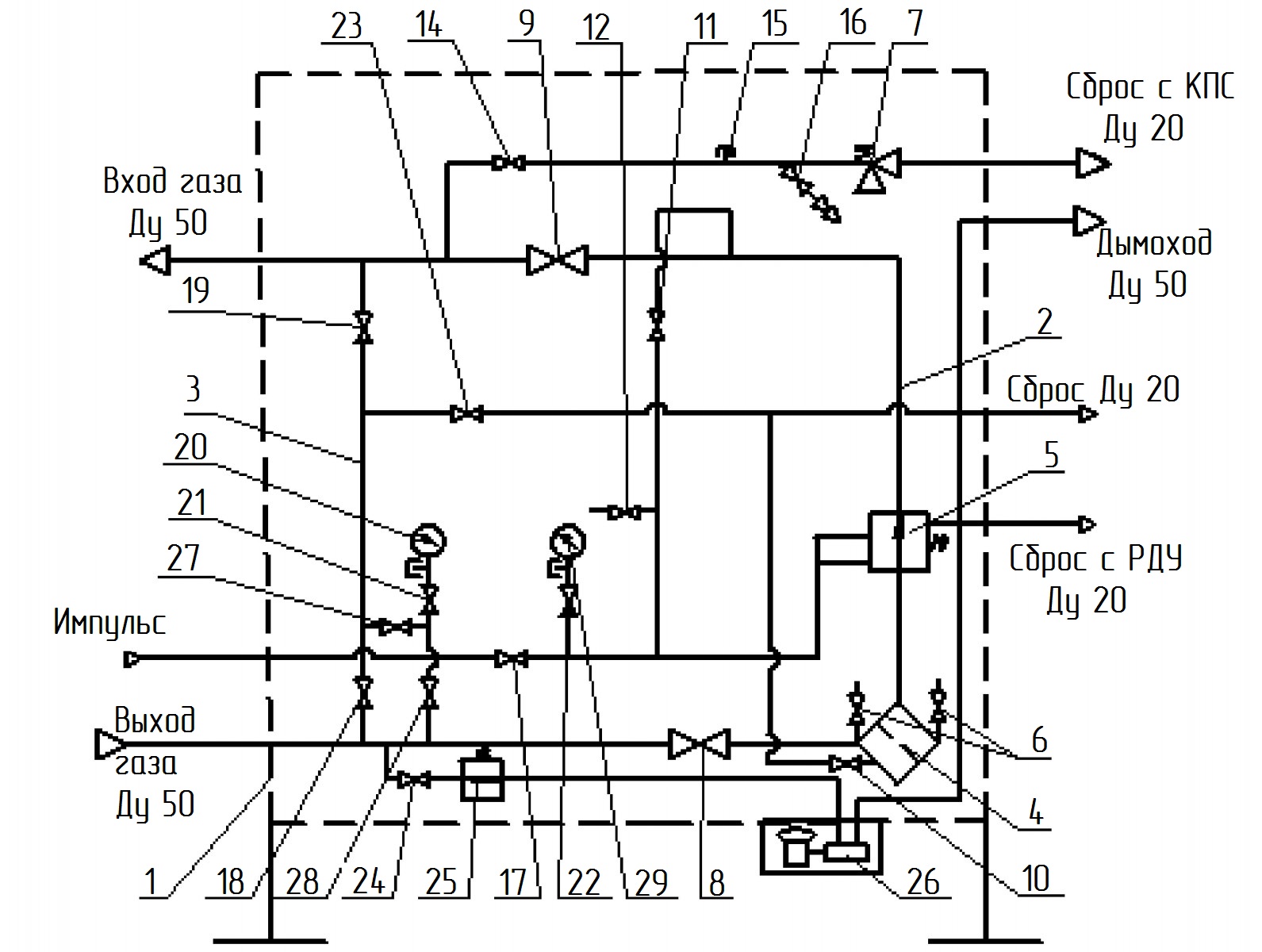 1-шкаф; 2-основная линия редуцирования; 3-обводная линия (байпас); 4-фильтр газовый; 5-регулятор РДУ-32; 7-клапан предохранительно-сбросной КПС-20Н; 8-12, 14, 16-19, 23, 24, 27, 28 - краны шаровые; 21-22 - устройства запорно-сбросные; 20-манометр; 29-мановакууметр; 15-штуцер с заглушкой; 25-регулятор РДСГ-1-1,2; 26-обогреватель