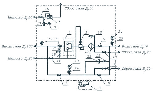 1 — регулятор давления газа РДБК-50; 2 — клапан предохранительно-запорный; 4 — клапан сбросной; 18–20, 23, 25 — клапаны трехлинейные; 3 — обогреватель; 5–11, 14–17 — краны; 12 — фильтр сетчатый; 13 — прибор замера перепада давления; 21, 24 — манометры; 22 — регулятор давления газа РДСГ1-1,2