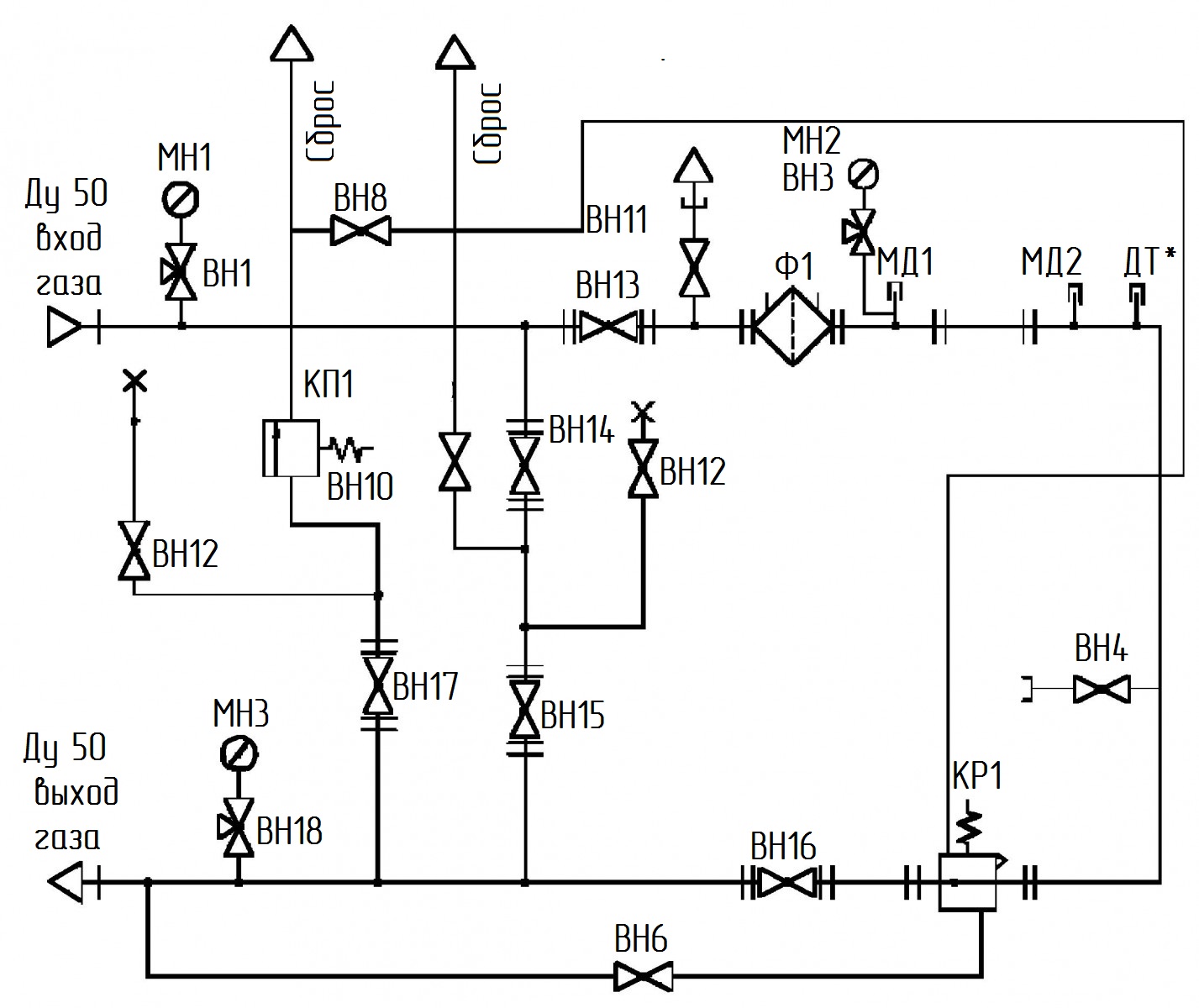 ВН1-ВН3, ВН18 - кран трехходовой д/манометр; ВН4, ВН6, ВН8 - кран шаровой муфтовый 11б27п Ду 15; ВН10, ВН11 - кран шаровой муфтовый 11б27п Ду 20; ВН12 - кран манометра МН15; ВН13-ВН17 - кран шаровой КШ-50-16; ВН12 - кран кнопочный манометра МН15ф."Kromschroder"; КП1 - кран пружинный сбросной ПСКУ-50 Н/5; КР1 - регулятор давления MR50 "Elster" (Германия); МН1, МН2** - манометр 0,6 МПа; МН3** - манометр 10 кПа; МД1, МД2 - места отбора давления; Ф1 - фильтр газа ФГ16-50 (оснащен индикатором перепада давления ДПД 16); ДТ1**-гильза термометра.