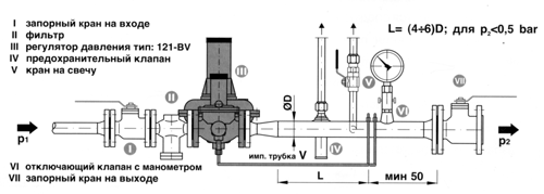Регулятор тип 121-BV оснащен встроенным ПЗК. По требованию заказчика регулятор может комплектоваться ПЗК, срабатывающим только от повышения выходного давления (-v) или ПЗК, срабатывающим как от превышения, так и понижения выходного давления (-v/n). Регулятор должен работать на очищенном газе. Перед регулятором должен быть установлен фильтр. Монтаж регулятора производится в горизонтальном или вертикальном положении. Для отвода газа от дыхательного клапана предусмотрено резьбовое отверстие R3/4" для подсоединения сбросной трубки и выброса газа за пределы помещения. Стандартно регулятор монтируется при потоке газа слева направо.