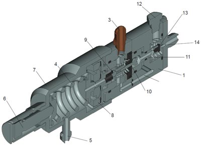 Редуктор – задатчик РЗ состоит из сборного корпуса 1, поршня 11 с клапаном 13, расположенным на его нижнем конце, управляющего клапана 10 и сбросного клапана 9, металлической мембраны 8, основной пружины 4 и регулировочного винта 6.