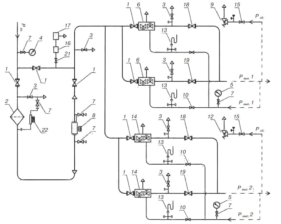 1, 3, 7, 10, 15, 21 — краны шаровые; 2 — фильтр ФГ; 4 — входной манометр типа МТ; 5 — выходной манометр типа МТ; 6 — регулятор давления газа комбинированный; 8 — счетчик газовый; 9, 12 — предохранительный сбросной клапан; 13 — манометр водяной (не комплектуется); 14 — регулятор давления газа комбинированный; 16 — регулятор давления (для отопления); 17 — газогорелочное устройство; 18, 19 — кран шаровой (с механическим приводом); 22 — индикатор перепада давления ИПД.